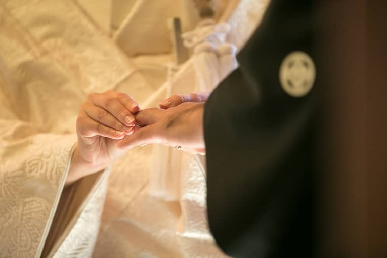 ”人前式”では、雄蝶雌蝶による三々九度にて夫婦の契りを交わし、お二人らしい誓いの言葉を綴った誓詞の朗読とその披露を行います。