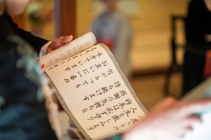 ”人前式”では、雄蝶雌蝶による三々九度にて夫婦の契りを交わし、お二人らしい誓いの言葉を綴った誓詞の朗読とその披露を行います。