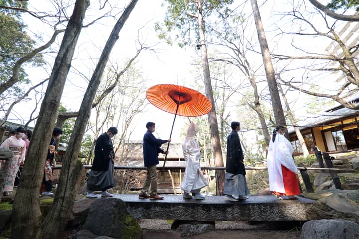 ”神前式”では、伝統の花嫁行列をもって庭を進んでいただき、 雅楽の生演奏の中で修祓の儀や祝詞奏上など厳かな儀式が執り行われます。